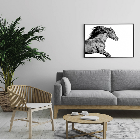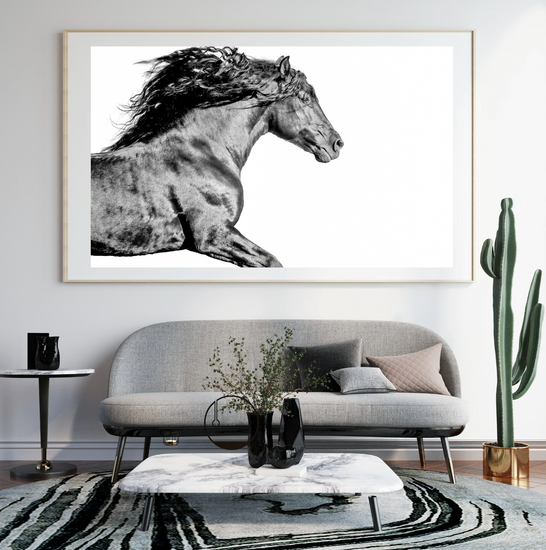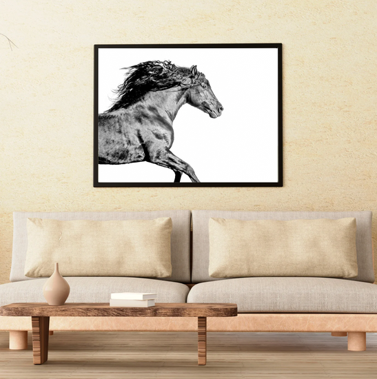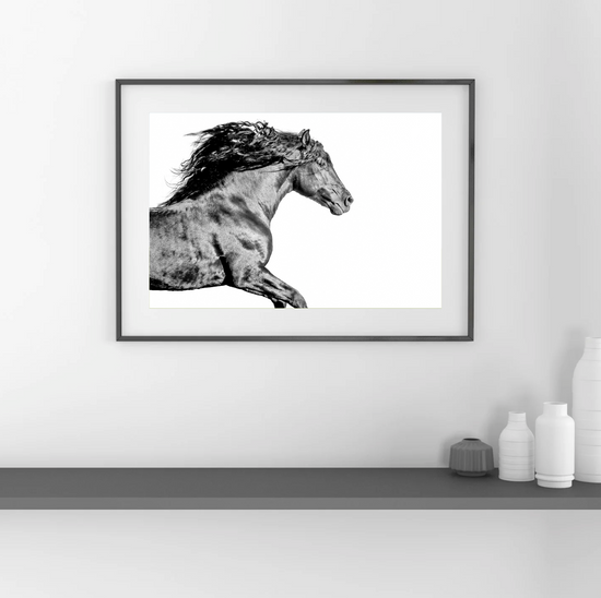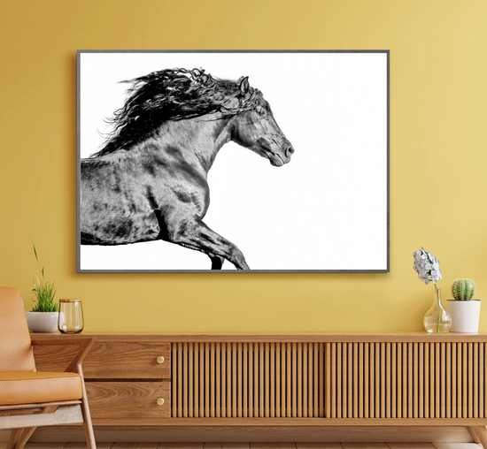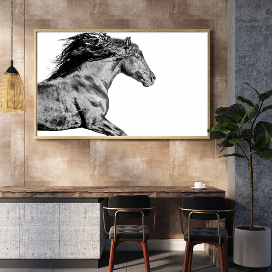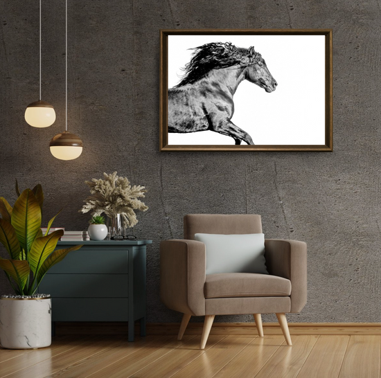 Lit from within, this stallion surges forward like a flame caught in muscle and motion. Shadows dance across his coat like flickers of heat, his mane wild as smoke.