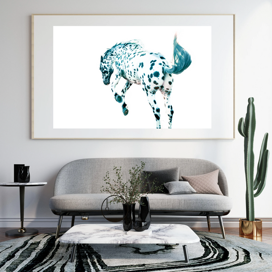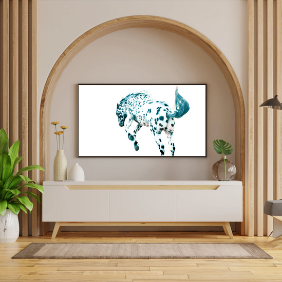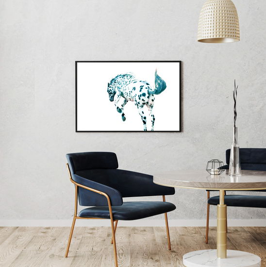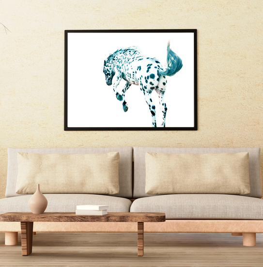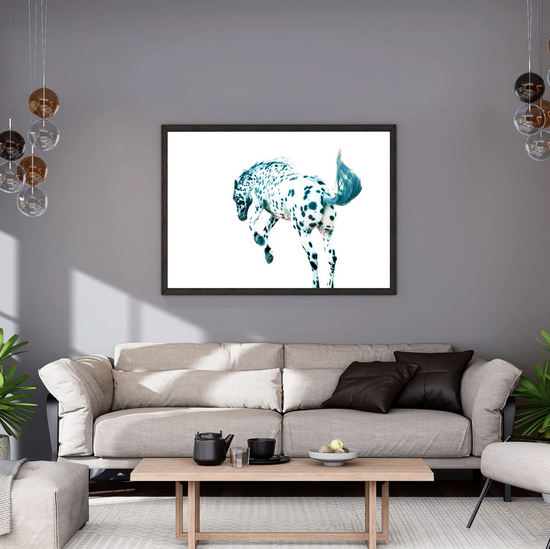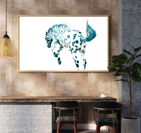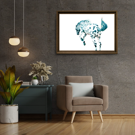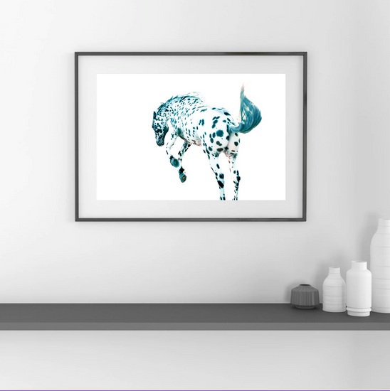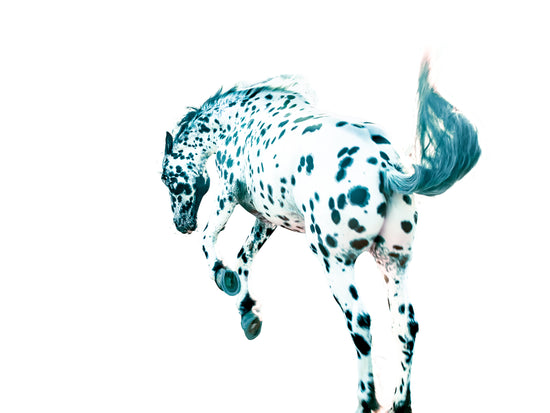 Like weathered copper kissed by desert storms, Patina bucks into frame with joyful rebellion. His teal-tinted tail and spotted coat dance in perfect imperfection—an ode to age, artistry, and authenticity.