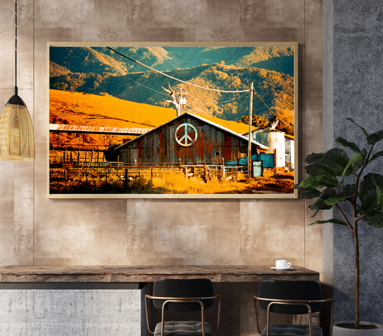 A warm glow washes over the rolling hills and the weathered barn adorned with a peace sign, standing tall against the backdrop of California’s timeless landscape. This piece invites you to slow down, breathe, and embrace the simple beauty of a golden afternoon. Capturing the spirit of quiet resilience and rustic charm, Peaceful Fields is more than a photograph—it’s an open window to the West’s enduring soul.