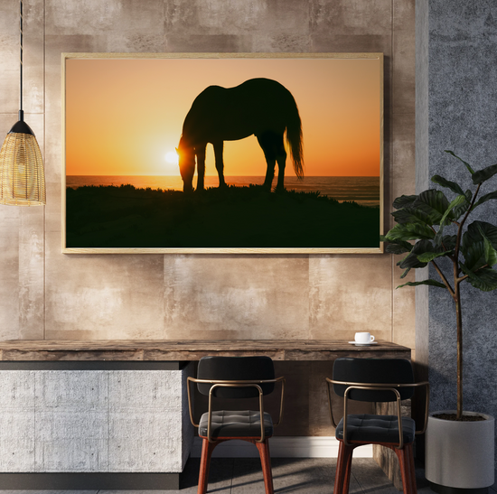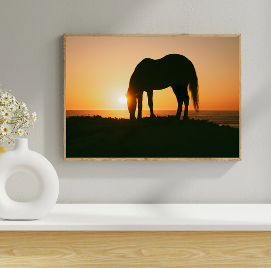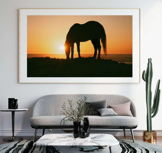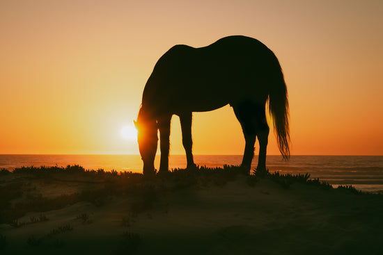 Bathed in the last golden light, a domesticated mustang grazes at the edge of the Pacific, where the land exhales and the sun bows low.