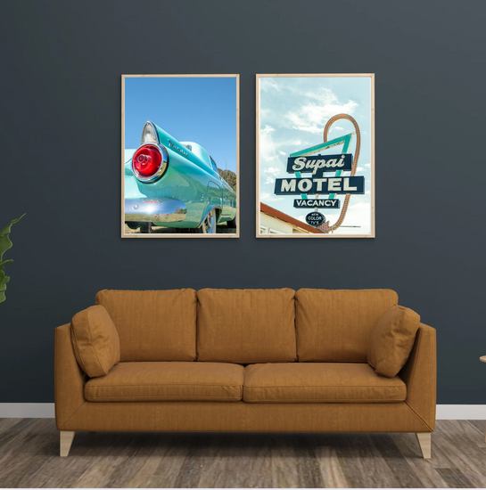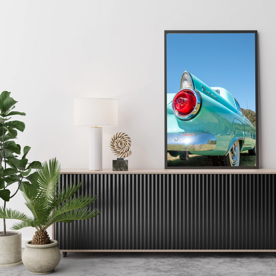 " Someday- Turquoise Ford Thunderbird Fins captures the timeless allure of classic car interiors, bathed in the dreamy hues of turquoise—my favorite color, obviously! This piece is a nod to the cherished dream of owning a vintage gem someday, embodying both nostalgia and hope. The chrome details and retro design spark memories of open roads and endless possibilities.