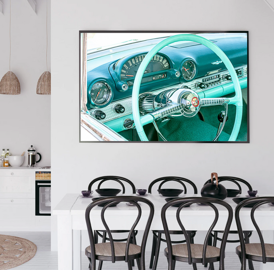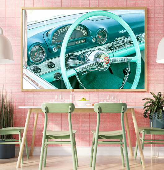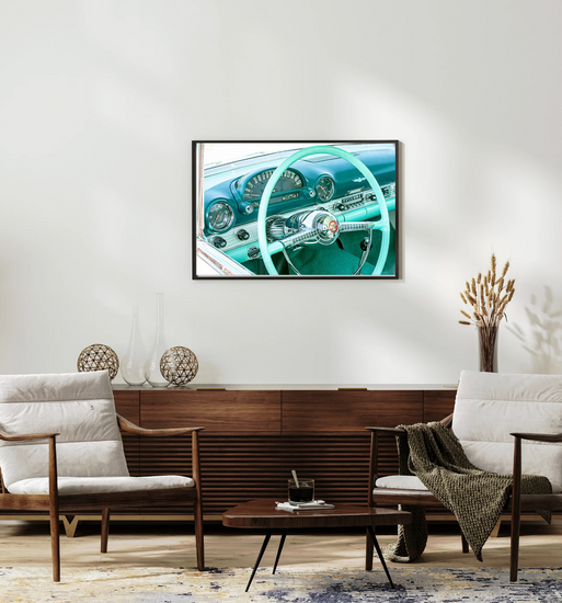 "Someday" captures the timeless allure of classic car interiors, bathed in the dreamy hues of turquoise—my favorite color, obviously! This piece is a nod to the cherished dream of owning a vintage gem someday, embodying both nostalgia and hope. The chrome details and retro design spark memories of open roads and endless possibilities.