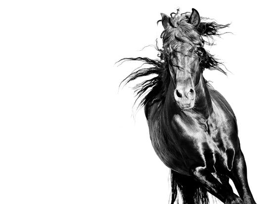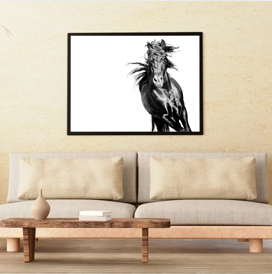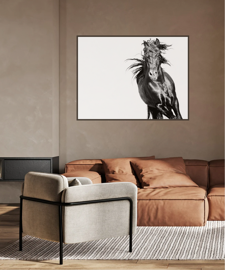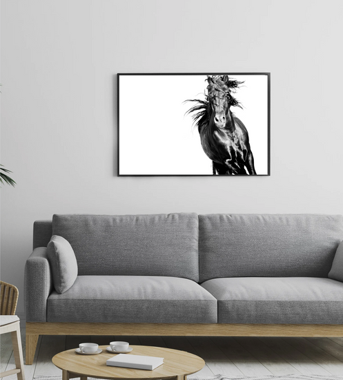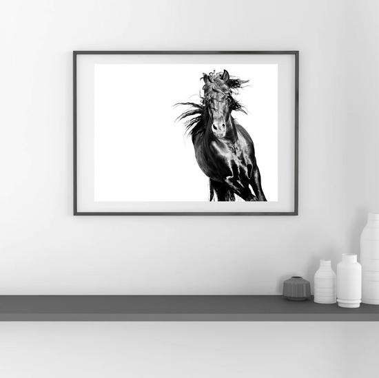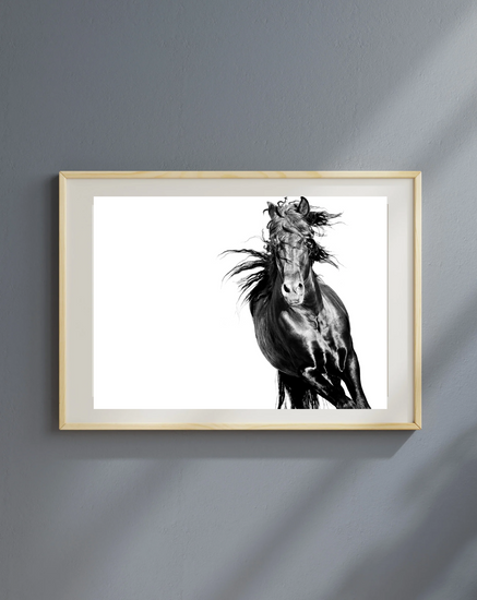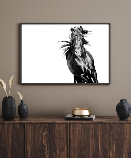 A portrait of raw strength and motion, this black stallion gallops through the frame like a storm breaking free. Every twist of mane and muscle speaks to a spirit unchained—wild, relentless, and utterly untamed.