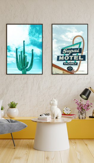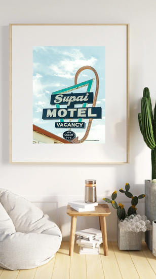 Bold, nostalgic, and unmistakably Americana—“Vacancy Dreams” captures the iconic Supai Motel sign glowing under an open desert sky along historic Route 66. With its retro colors, weathered neon, and promise of “New Color TV’s,” this piece is a love letter to mid-century road trips and the quirky charm of the American Southwest.