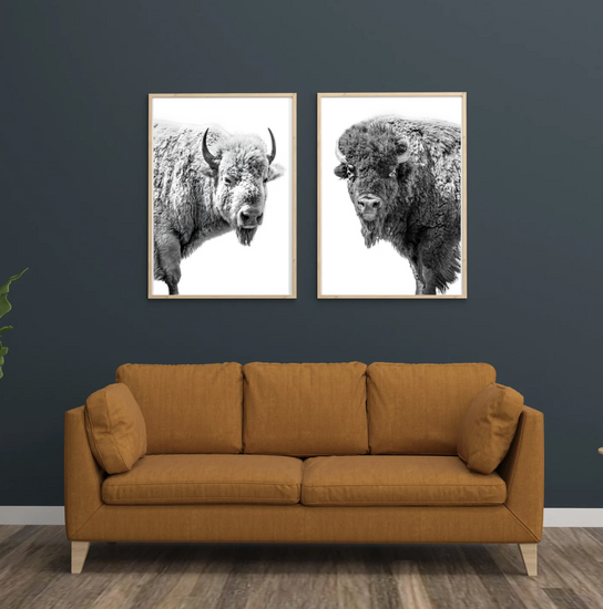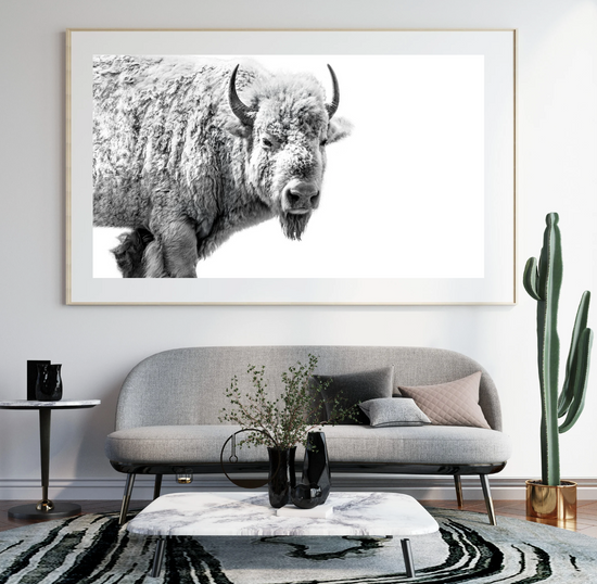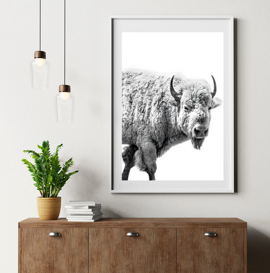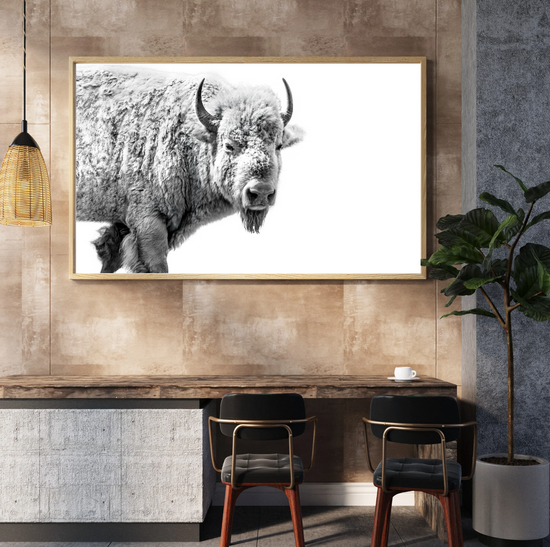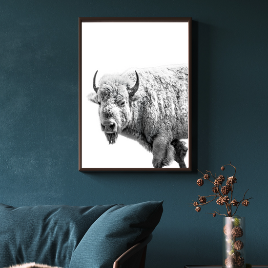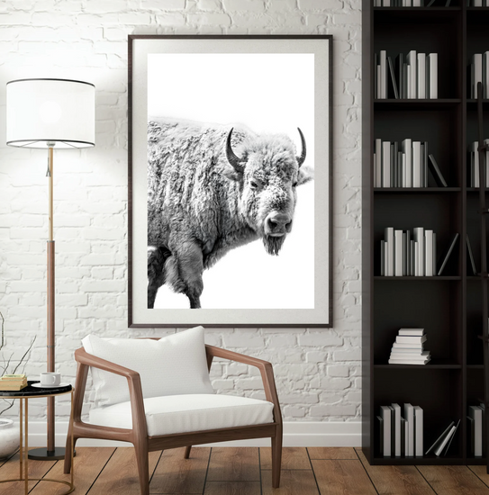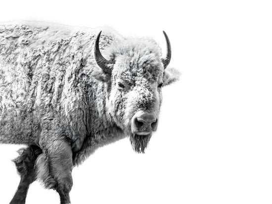 A rare white buffalo, captured in quiet command—his presence both a whisper and a roar. Revered in legend, grounded in dust. This image honors the sacred and wild spirit of the American plains.
